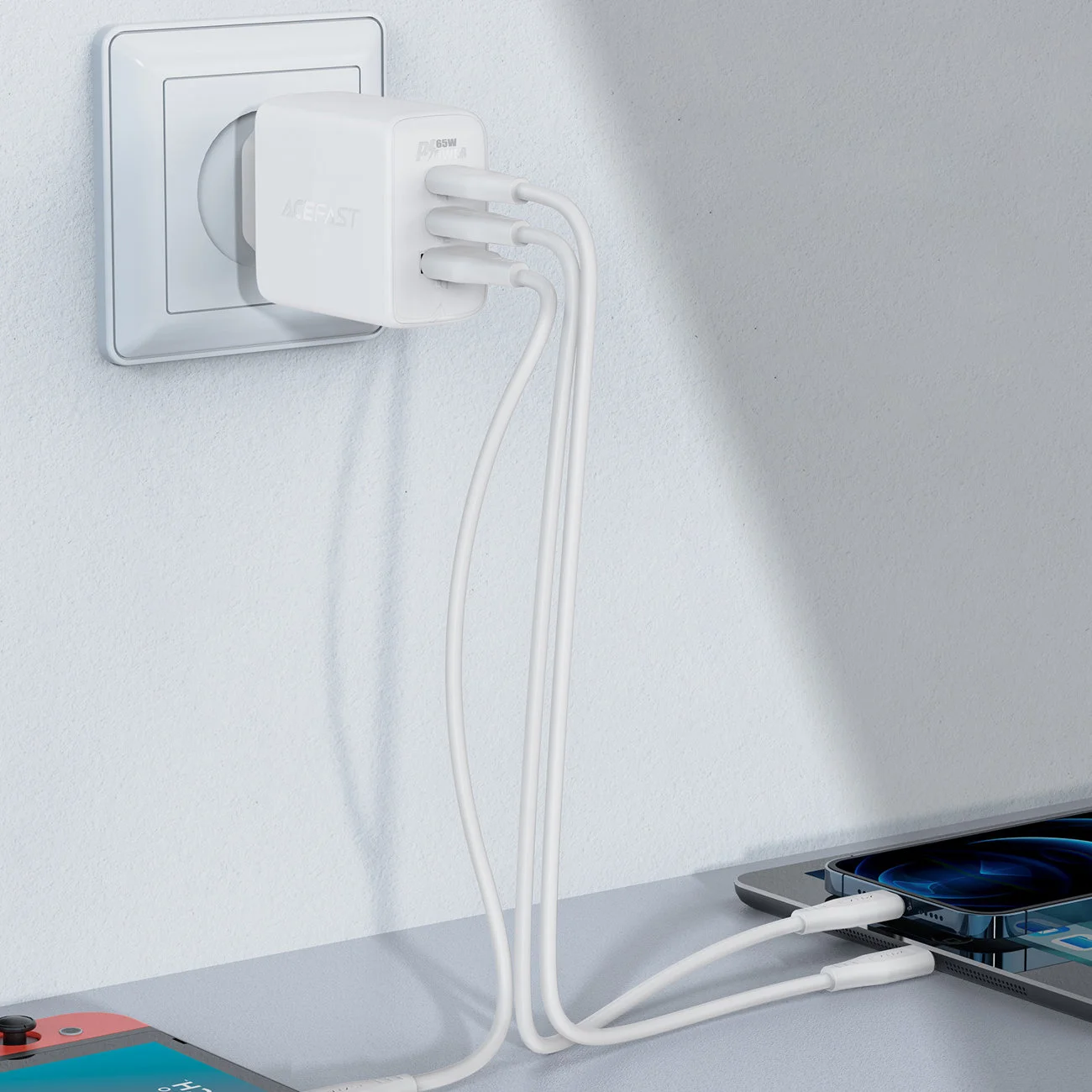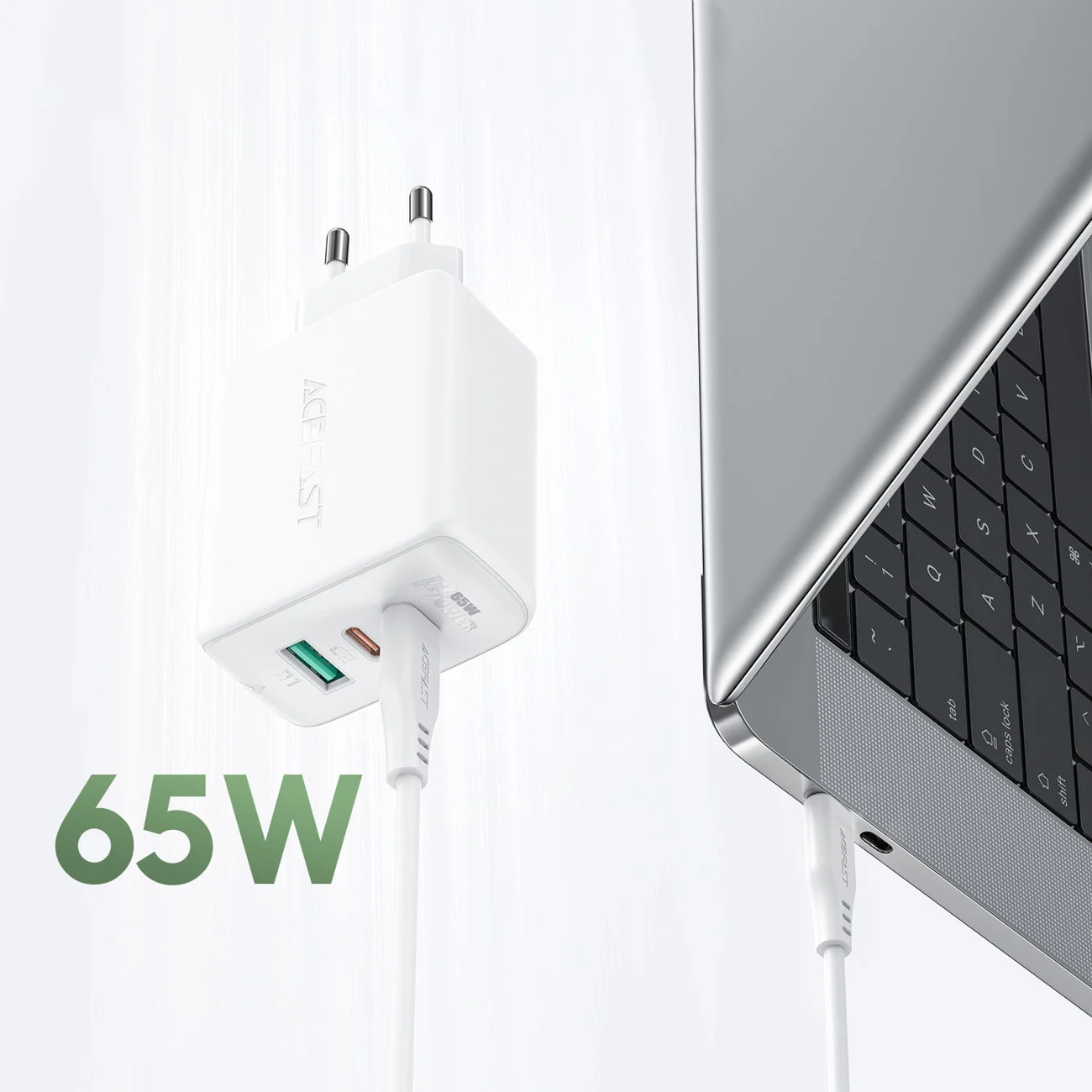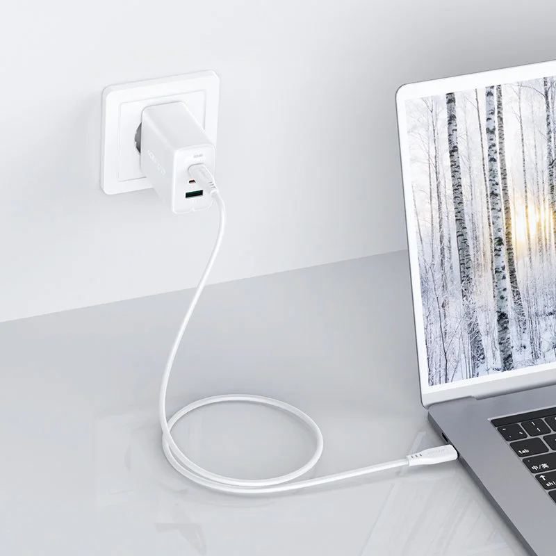 Zestaw zawiera: 2w1 Ładowarka sieciowa 2x USB-C USB 65W + kabel USB-C biały.