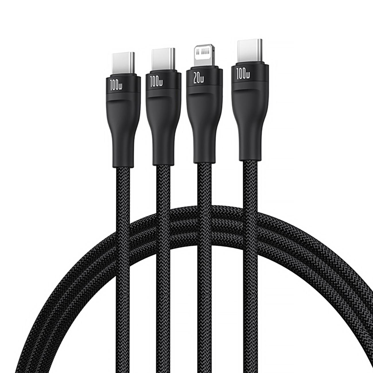 Kabel Baseus Flash Series 3w1 to doskonały wybór dla tych, którzy szukają wydajnego rozwiązania do ładowania wielu urządzeń jednocześnie. Dzięki mocy 100W oraz inteligentnemu zarządzaniu energią, zapewnia szybkie i bezpieczne ładowanie. Wykonany z wysokiej jakości materiałów, takich jak nylonowy oplot i stop aluminium, gwarantuje trwałość i odporność na uszkodzenia.