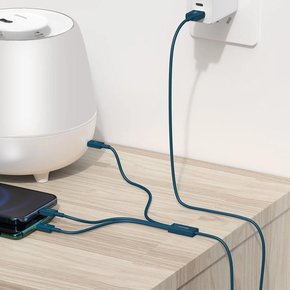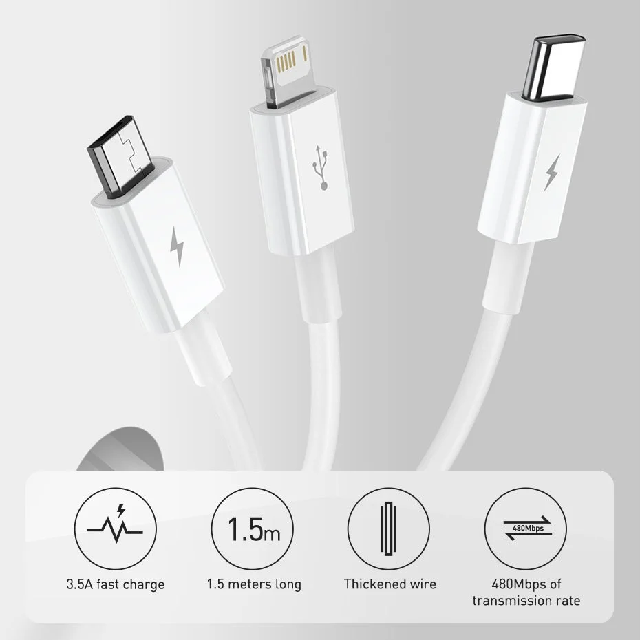 Oszczędzaj miejsce i ciesz się wygodą z uniwersalnym kablem, który obsługuje trzy różne złącza: USB Typ C, micro USB oraz Lightning. To doskonałe rozwiązanie dla użytkowników różnych urządzeń.