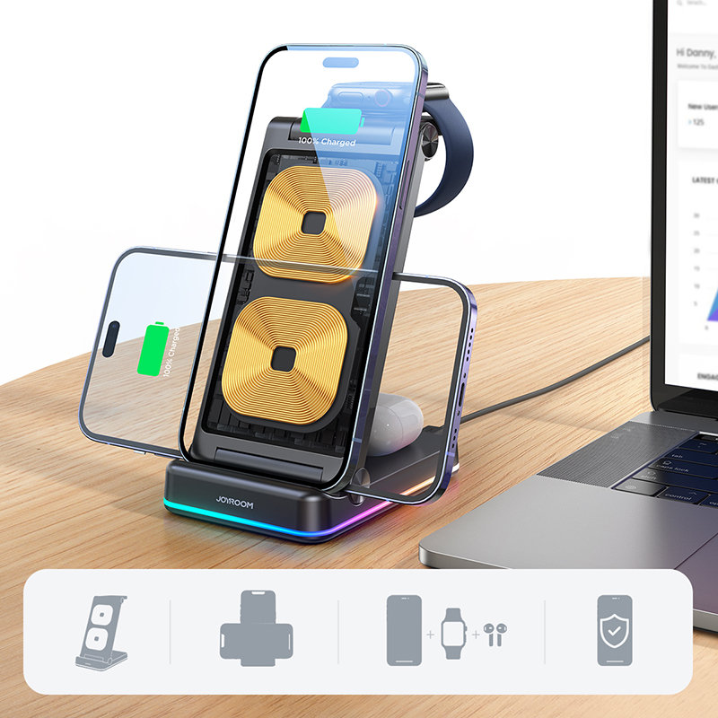 Ładowarka indukcyjna marki Joyroom to praktyczne rozwiązanie dla użytkowników urządzeń elektronicznych. Dzięki możliwości ładowania trzech urządzeń jednocześnie, zyskujesz wygodę i oszczędność czasu. Kompaktowa konstrukcja umożliwia łatwe złożenie ładowarki, co sprawia, że jest idealna do biura, na stół czy półkę.