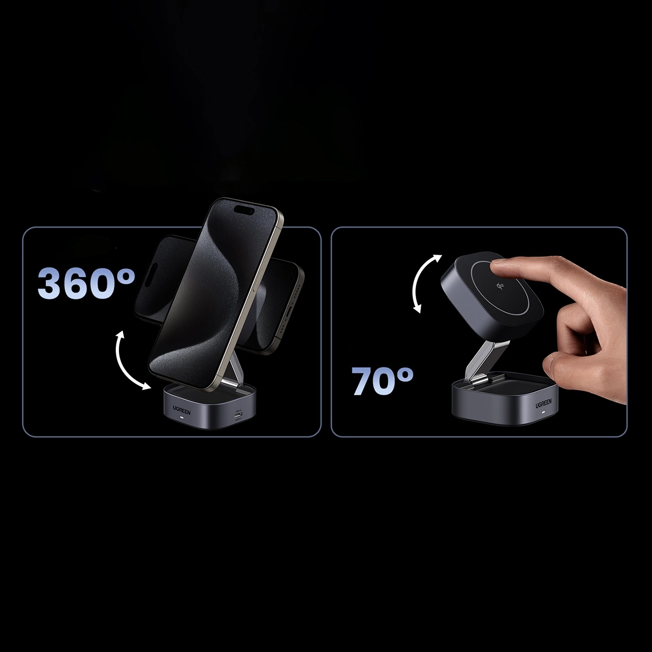 Ładowarka Ugreen W702 jest łatwa do przenoszenia, dzięki możliwości złożenia w mały kwadrat. Jej regulowana wysokość i kąt nachylenia sprawiają, że jest wygodna w użyciu wszędzie tam, gdzie potrzebujesz.