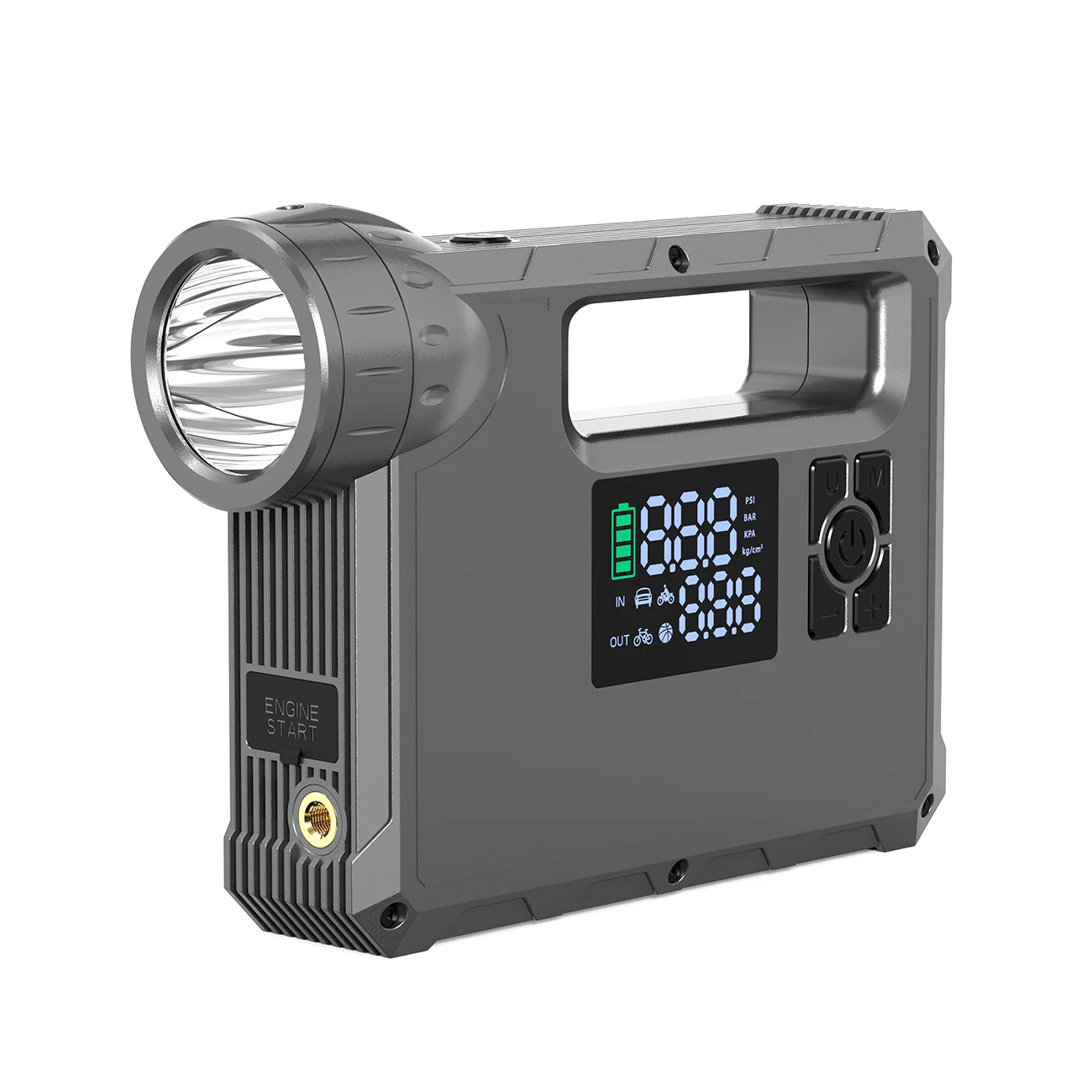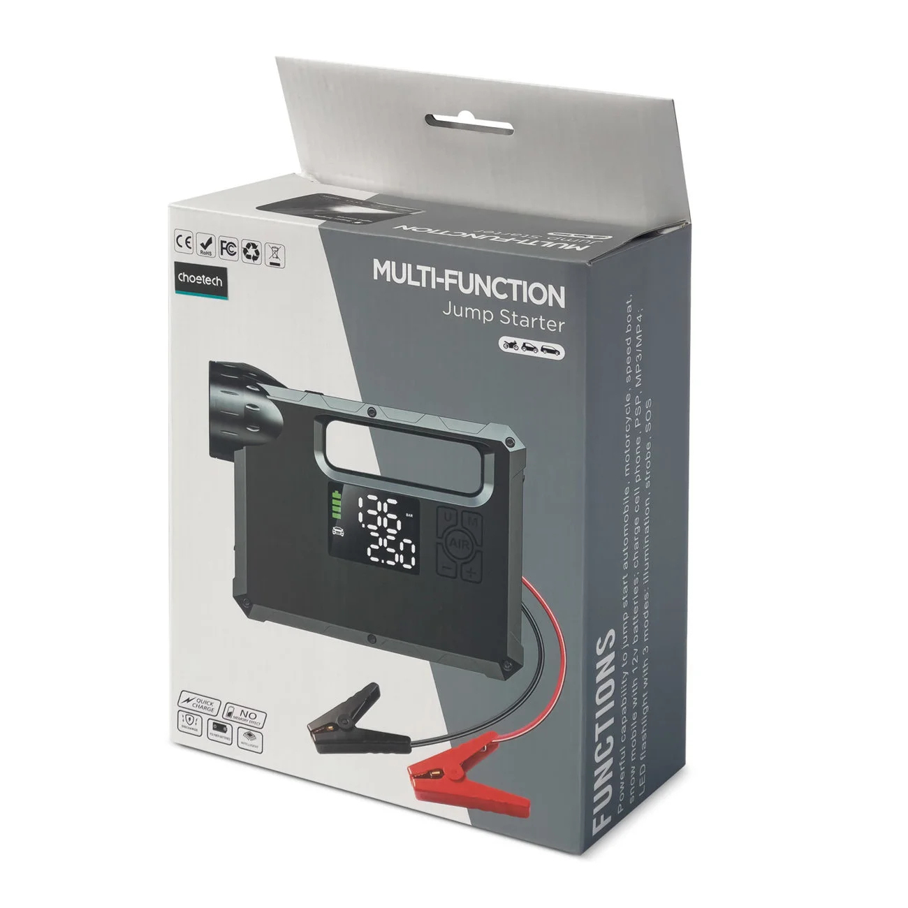 4w1 Rozruch auta Jump Starter + powerbank 8000mAh + kompresor + latarka LED - czarny to niezastąpione urządzenie dla każdego kierowcy, które łączy w sobie kilka funkcji przydatnych w nagłych sytuacjach.