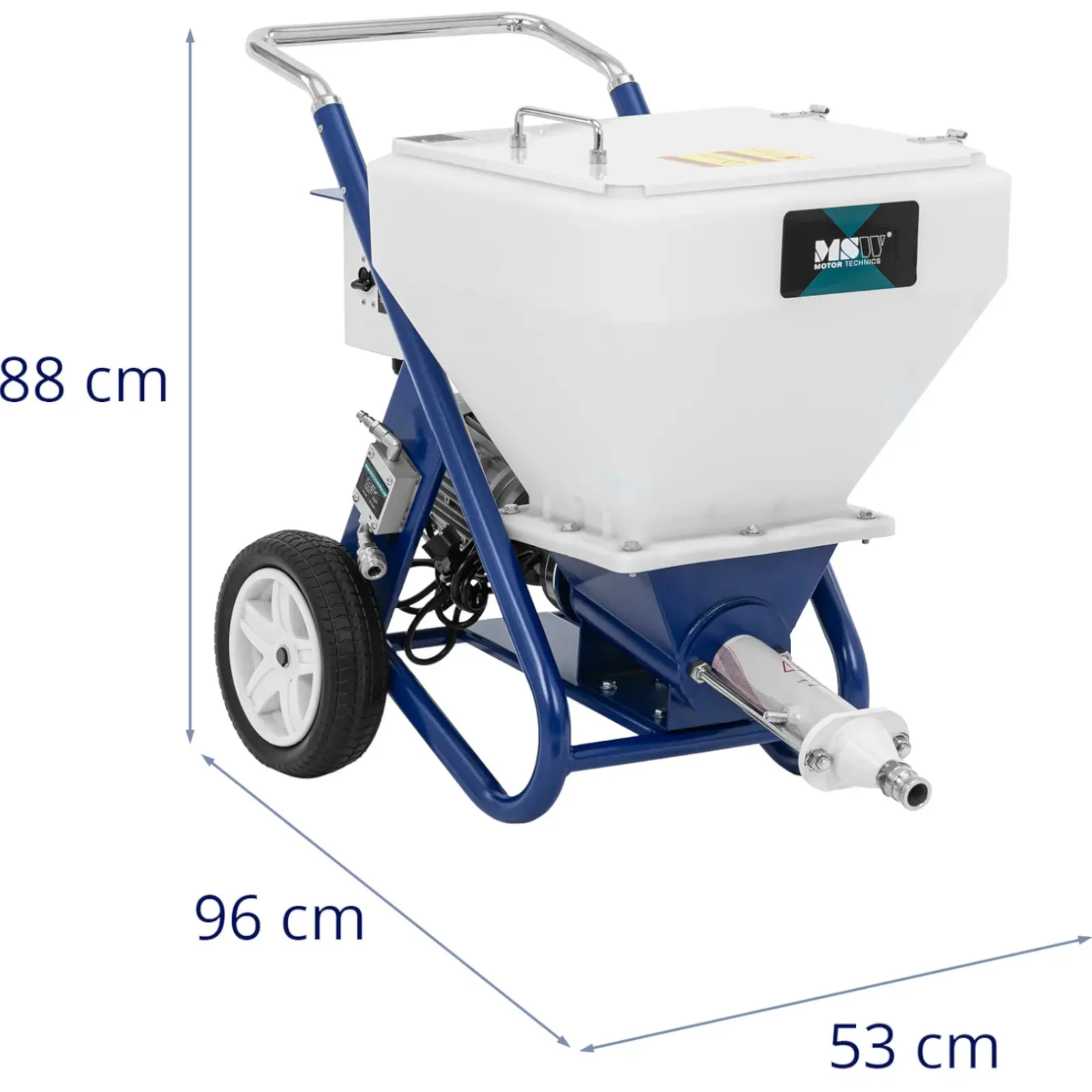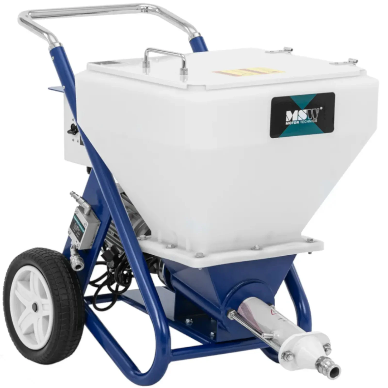 Agregat tynkarski MSW to efektywne urządzenie, które umożliwia szybkie i równomierne nakładanie tynku na ściany. Idealnie sprawdzi się przy aplikacji tynku wodnego, zarówno na bazie gipsu, wapna, jak i cementu. Dzięki ciśnieniu roboczemu wynoszącemu 20 bar, zaprawa jest precyzyjnie rozprowadzana, co zapewnia doskonałą konsystencję i stabilność na powierzchniach pionowych.