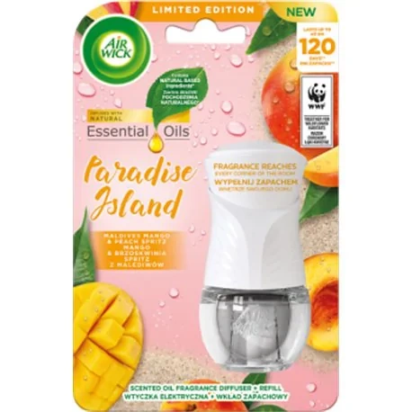 Air Wick Paradise Island to wyjątkowy odświeżacz powietrza, który przeniesie Cię w egzotyczne klimaty tropikalnej wyspy. Dzięki starannie dobranym nutom zapachowym, poczujesz świeżość owoców i kwiatów tropikalnych, które wypełnią Twój dom przyjemną atmosferą relaksu. Formuła odświeżacza została wzbogacona o naturalne olejki eteryczne, co gwarantuje trwały i intensywny zapach nawet do 120 dni.