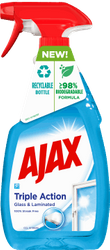 Ajax Triple Action charakteryzuje się nową, bardziej efektywną formułą, która utrudnia osadzanie się pary wodnej. Dzięki temu czyszczone powierzchnie są dłużej zachowane w czystości. Płyn jest produkowany z troską o środowisko, a jego formuła w 98% jest biodegradowalna. Ponadto, opakowanie jest w 100% nadające się do recyklingu.