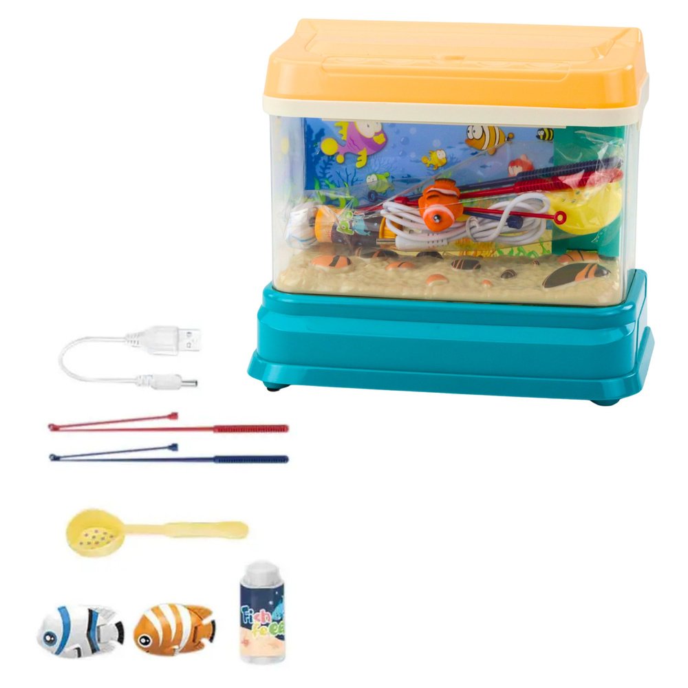 Zabawka pełni dwie funkcje – edukacyjną i dekoracyjną. Dzieci mogą bawić się w łowienie rybek za pomocą wędek lub sitka, rozwijając przy tym zręczność, cierpliwość i koordynację ruchową. Jednocześnie akwarium może pełnić rolę lampki nocnej – po podłączeniu do zasilania USB całość pięknie się podświetla, a z górnej pokrywy wypływają cztery strumienie wody, tworząc efekt bąbelków. Dodatkowym atutem jest wbudowana przyjemna melodyjka, która umila zabawę i wprowadza w relaksujący nastrój.
