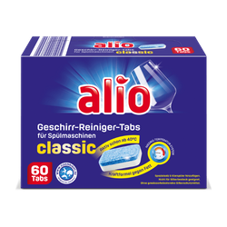 Alio Classic to skuteczne tabletki do zmywarki, które zapewniają doskonałe rezultaty w zmywaniu naczyń. Działają już od 40 °C, co pozwala na oszczędność energii. Ich innowacyjna formuła skutecznie zwalcza tłuszcz, pozostawiając naczynia błyszczące i wolne od smug.