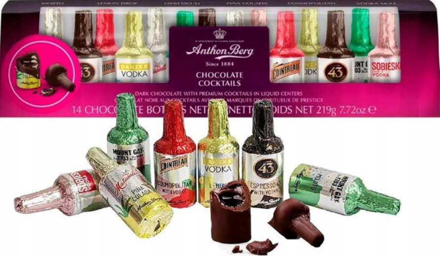 Anthon Berg Chocolate Cocktails to wyjątkowa kolekcja pralin inspirowanych najbardziej znanymi koktajlami świata. Każda czekoladka została wykonana z najwyższej jakości ciemnej czekolady i wypełniona płynnym nadzieniem o smaku kultowych drinków, takich jak Mojito, Cosmopolitan, Espresso Martini czy Margarita.