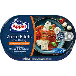 Delikatne filety śledziowe MSC uszlachetnione w aromatycznym sosie pomidorowo-mozzarellowym z bazylią.