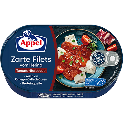 Delikatne filety śledziowe MSC w śmietanie pomidorowej o delikatnym smaku szynki.