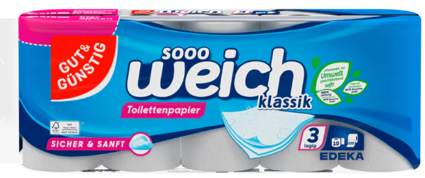 • Papier toaletowy niemiecki: Wytrzymały, 4-warstwowy, ekologiczny (z recyklingu) oraz wyjątkowo komfortowy nawilżany papier toaletowy od marek takich jak Jeden Tag czy Hakle.