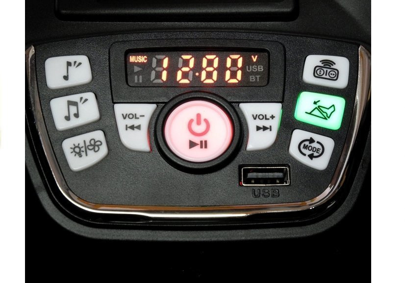Wewnątrz sportowego bolidu dla maluchów znajdują się tylko niezbędne elementy, co jest charakterystycznym zabiegiem stosowanym podczas konstruowania wyścigowych pojazdów. Kilkulatek będzie mieć do swej dyspozycji wygodny fotel wykonany z ekoskóry. Szerokość fotela to około 35 cm, co jest gwarancją komfortowej zabawy. Następnym, koniecznym elementem jest obrotowa kierownica o niecodziennym kształcie, na której środku umieszczono klakson. Uczcie swego kierowcę od najmłodszych lat, że bezpieczeństwo to podstawa udanej zabawy. Tuż obok kierownicy znajduje się podświetlana imitacja wskaźników, dwa wyloty kanałów wentylacyjnych, a także panel z wyświetlaczem. Znajdziesz na nim wskaźnik przedstawiający poziom naładowania akumulatora, a także wybrany moduł — odtwarzacz muzyczny, USB lub Bluetooth. Kiedy stan akumulatora wynosi mniej niż 8V, pojazd zostanie automatycznie wyłączony. By zabawa była jeszcze prostsza, mały kierowca może korzystać z dźwigni zmiany biegów, w dużym stopniu podnoszącej poziom realizmu zabawy.