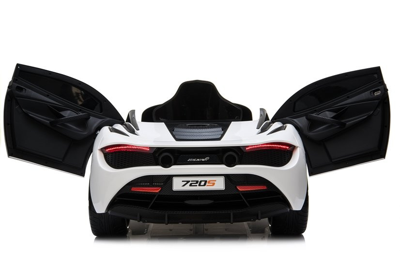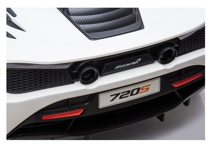 W konstrukcji dziecięcego samochodu McLaren 720S wzrok przyciąga przede wszystkim innowacyjny sposób otwierania drzwi ku górze, liczne przetłoczenia, nadające wrażenie dynamizmu oraz tylne lampy w kształcie wąskich pasków złożone z diod LED. To tylko nieliczne ze smaczków atrakcyjnego nadwozia w głębokim, białym kolorze. Sportowa konstrukcja auta w duecie z łagodnie opadającą linią dachu wyróżnia model McLaren 720S na tle pozostałych, ekskluzywnych samochodów.