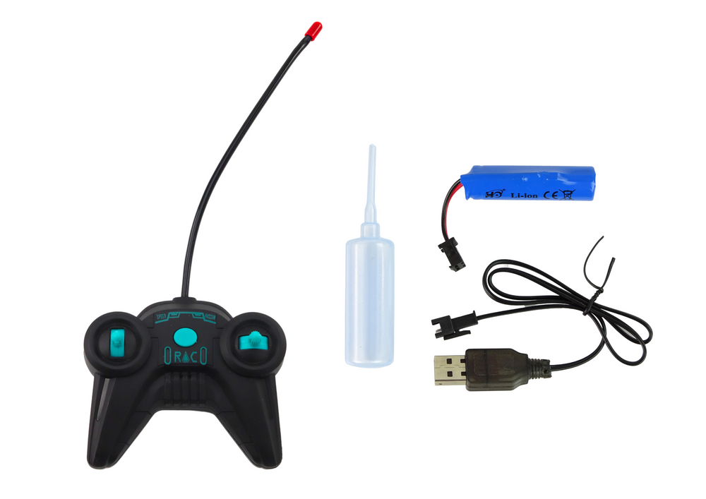 Ten dynamiczny samochód w zestawie zawiera wszystko, czego potrzebujesz do pełnej akcji zabawy. Wraz z samochodem o realistycznym wyglądzie otrzymasz buteleczkę na wodę, pilot, baterię oraz kabel USB do ładowania.