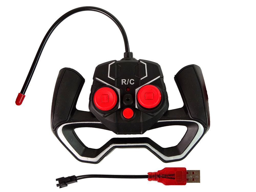 Czarny pilot z czerwonymi przyciskami jest lekki, poręczny i idealny dla małych rączek. Jego wymiary to: 13 cm x 9 cm x 3 cm. Wymiary auta to 20 cm x 13 cm x 9 cm. Zestaw zawiera autko, pilot oraz ładowarkę z wejściem USB 2.0 do ładowania akumulatora.