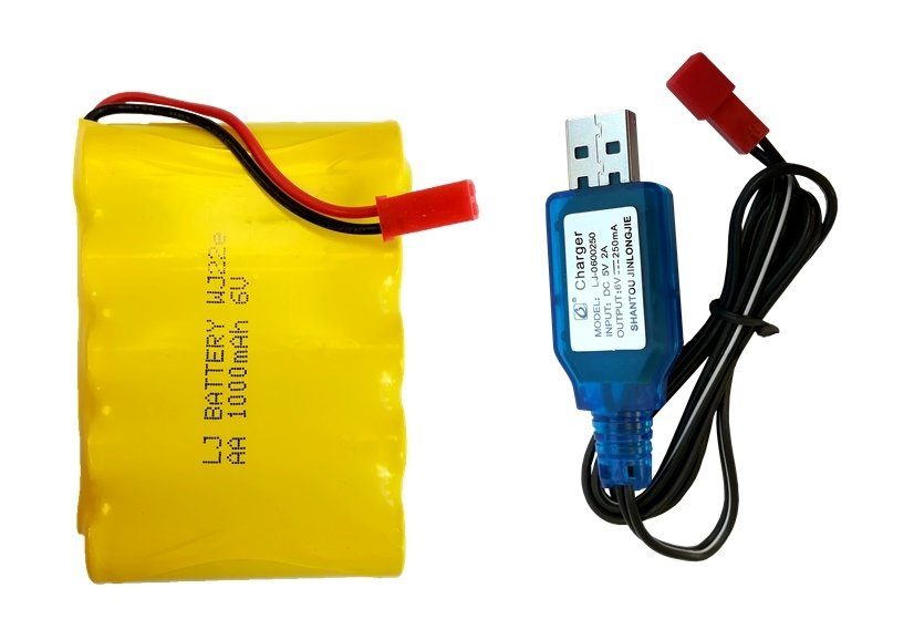 Zdalnie sterowane terenowe auto z napędem 4x4 zasilane jest za pomocą akumulatorka 6V, który ładuje się za pomocą dołączonego do zestawu kabelka USB. Do obsługi pilota niezbędne są 2 sztuki baterii AA - nie są one dołączone do zestawu.