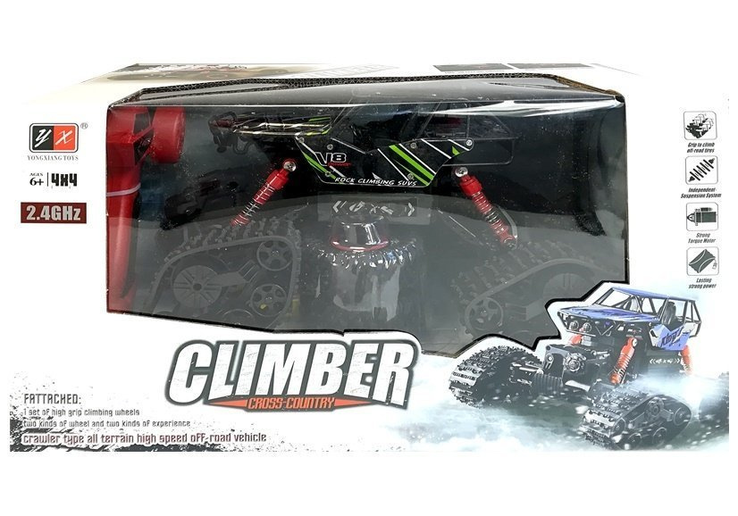 Zdalnie sterowane auto zasilane akumulatorkiem w czarno-zielonych barwach to pojazd gwarantujący użytkownikowi wspaniałą zabawę! Posiada wiele funkcji niedostępnych w innych modelach pojazdów sterowanych, takich jak napęd 4x4, amortyzatory i odporność na upadki. Wysokie zawieszenie i duże koła umożliwiają bezproblemową jazdę po nierównym terenie! Do zestawu dołączone są 2 komplety ogumienia: duże, pięciokątne gąsienice gwarantujące idealną przyczepność, oraz standardowe koła terenowe, zapewniające większą zwrotność pojazdu. Przednia oś pojazdu może być odpowiednio wyregulowana w prawo lub w lewo za pomocą wskazówki znajdującej się na podwoziu. Samochód kontrolowany jest przez pilot o częstotliwości 2,4 GHz, która zapewnia stałe połączenie z pojazdem.