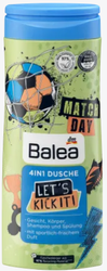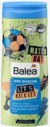 Żel pod prysznic 4w1 Let’s Kickiti marki Balea Kids to idealne rozwiązanie dla Twojego dziecka. Zapewnia radość podczas kąpieli, dzięki łagodnej formule, która skutecznie oczyszcza oraz pielęgnuje twarz, ciało i włosy. Produkt chroni skórę przed wysuszeniem, ułatwia rozczesywanie włosów i nadaje im gładkość.