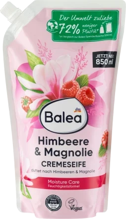 Balea Himbeere & Magnolie to wyjątkowe opakowanie uzupełniające mydła w kremie, które zachowuje naturalną równowagę nawilżenia skóry. Dzięki formule Moisture Care, produkt pomaga chronić skórę przed odwodnieniem, zapewniając jej odpowiednie nawilżenie.