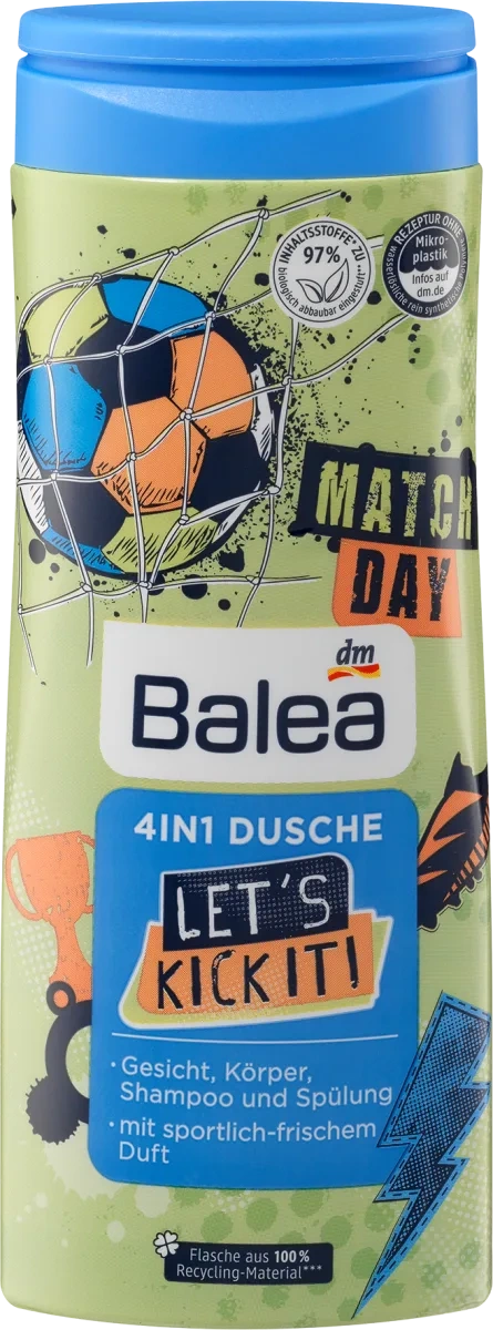 Oferuj swojemu dziecku codzienną zabawę podczas pielęgnacji z Balea Let’s kick it! 4w1 Żelem pod Prysznic. Dzięki unikalnej formule, produkt skutecznie chroni skórę przed wysuszeniem, a włosy stają się łatwiejsze do rozczesywania i bardziej elastyczne. To idealne rozwiązanie dla najmłodszych, które sprawia, że codzienna higiena jest przyjemnością.
