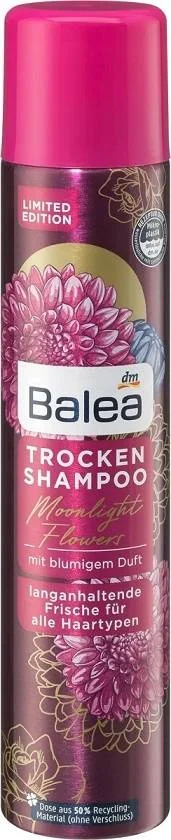 Suchy szampon Balea Moonlight Flowers to idealne rozwiązanie dla osób, które pragną szybko odświeżyć swoje włosy. Dzięki niemu w kilka sekund możesz cieszyć się świeżym wyglądem, nową objętością i przyjemnym chwytem. Produkt jest wolny od mikroplastików oraz syntetycznych polimerów rozpuszczalnych w wodzie, co czyni go bardziej przyjaznym dla środowiska.