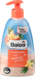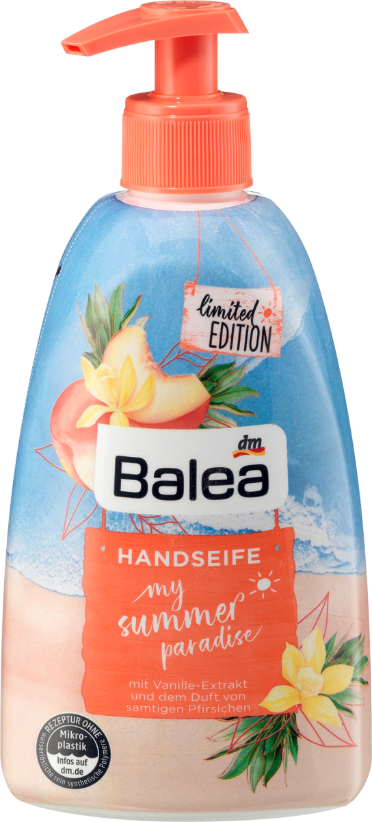 Ciesz się codzienną pielęgnacją rąk z mydłem w płynie Balea My Summer Paradise. To wyjątkowe mydło z ekstraktem z wanilii i zapachem aksamitnych brzoskwiń dba o naturalną równowagę nawilżenia Twojej skóry. Dzięki formule wolnej od mikroplastików oraz syntetycznych polimerów, jest to produkt przyjazny dla Twojej skóry i środowiska.