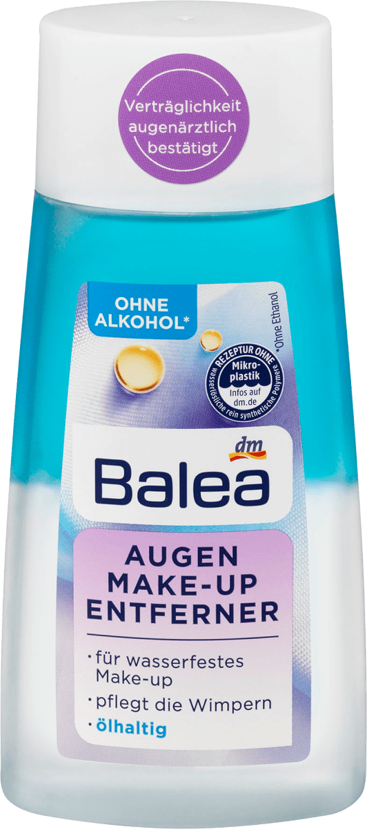 Dwufazowy płyn do demakijażu oczu Balea skutecznie usuwa wodoodporny makijaż, zapewniając jednocześnie delikatną pielęgnację. Dzięki formule wzbogaconej o prowitaminę B5, nawilża wrażliwą skórę wokół oczu oraz wspomaga kondycję rzęs.