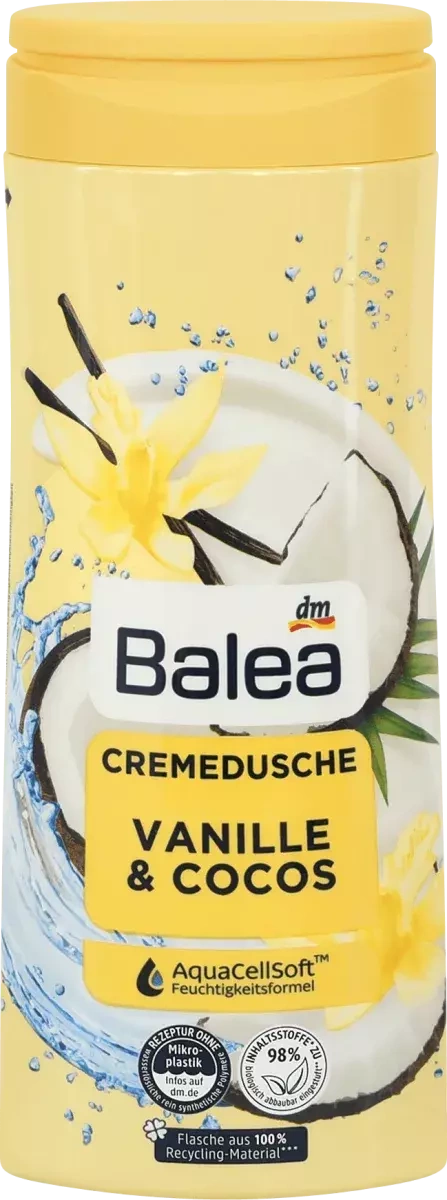 Rozpieszczaj swoje ciało codziennie za pomocą waniliowo-kokosowego żelu pod prysznic Balea. Formuła wzbogacona w proteiny mleka oraz AquaCellSoft skutecznie oczyszcza skórę, zapewniając jednocześnie intensywne nawilżenie. Żel tworzy delikatną piankę, która łagodnie myje ciało, a jego łagodna formuła sprawia, że jest idealny nawet dla wrażliwej skóry.