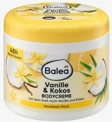 Balea Vanille & Kokos to wegański krem do ciała, który zapewnia nawilżenie suchej skóry przez 48 godzin. Dzięki olejowi kokosowemu oraz ekstraktowi z kokosa, skóra staje się miękka i elastyczna. Formuła z kompleksem ziołowym wspomaga elastyczność, pozostawiając skórę widocznie odżywioną.