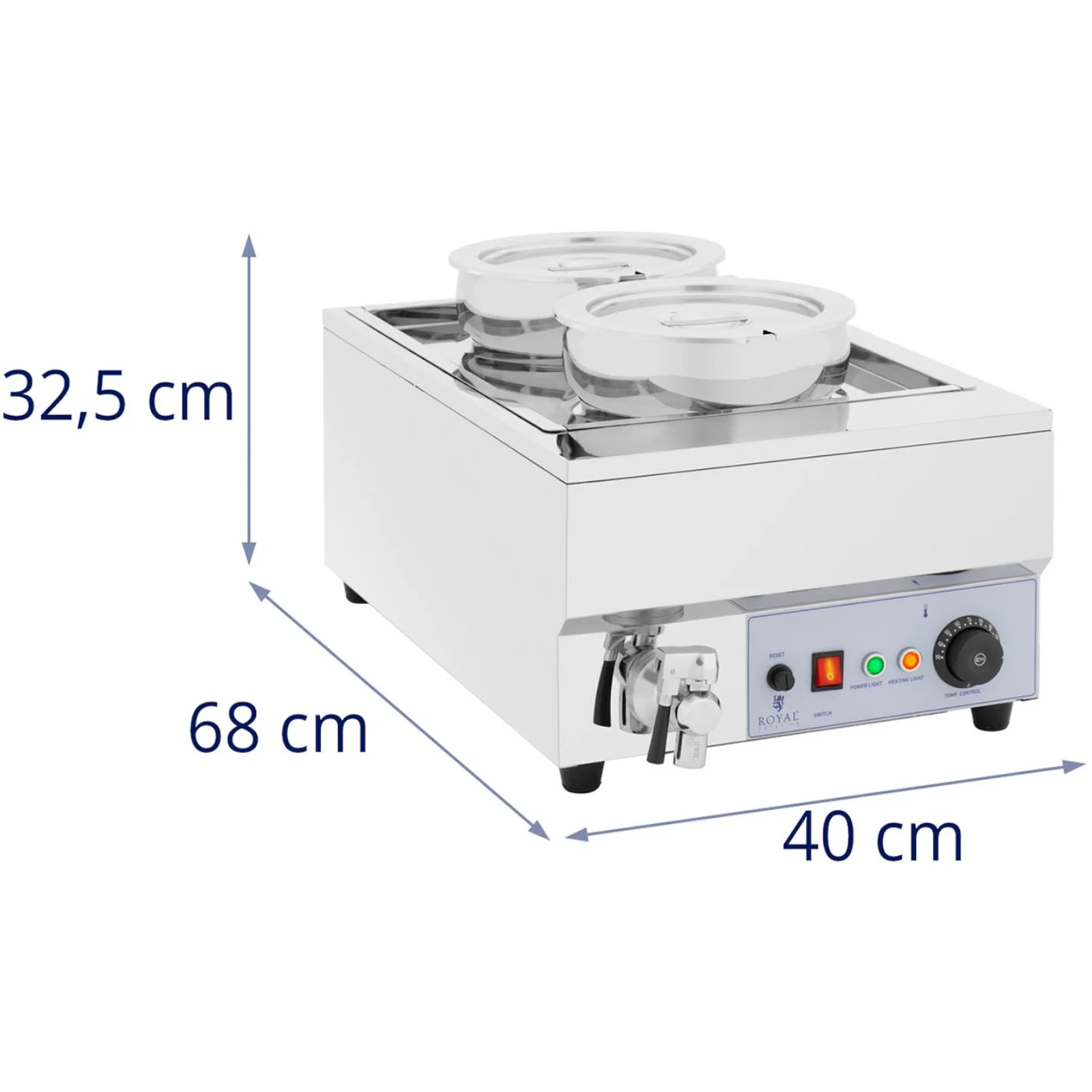 Stacja do zupy marki Royal Catering to funkcjonalne urządzenie, które idealnie sprawdzi się w restauracjach oraz małej gastronomii. Umożliwia efektywne podgrzewanie zup, gulaszów, sosów, a także czekolady oraz fondue. Dzięki dwóm garnkom o pojemności 2 x 7 l, możesz serwować różnorodne potrawy jednocześnie.