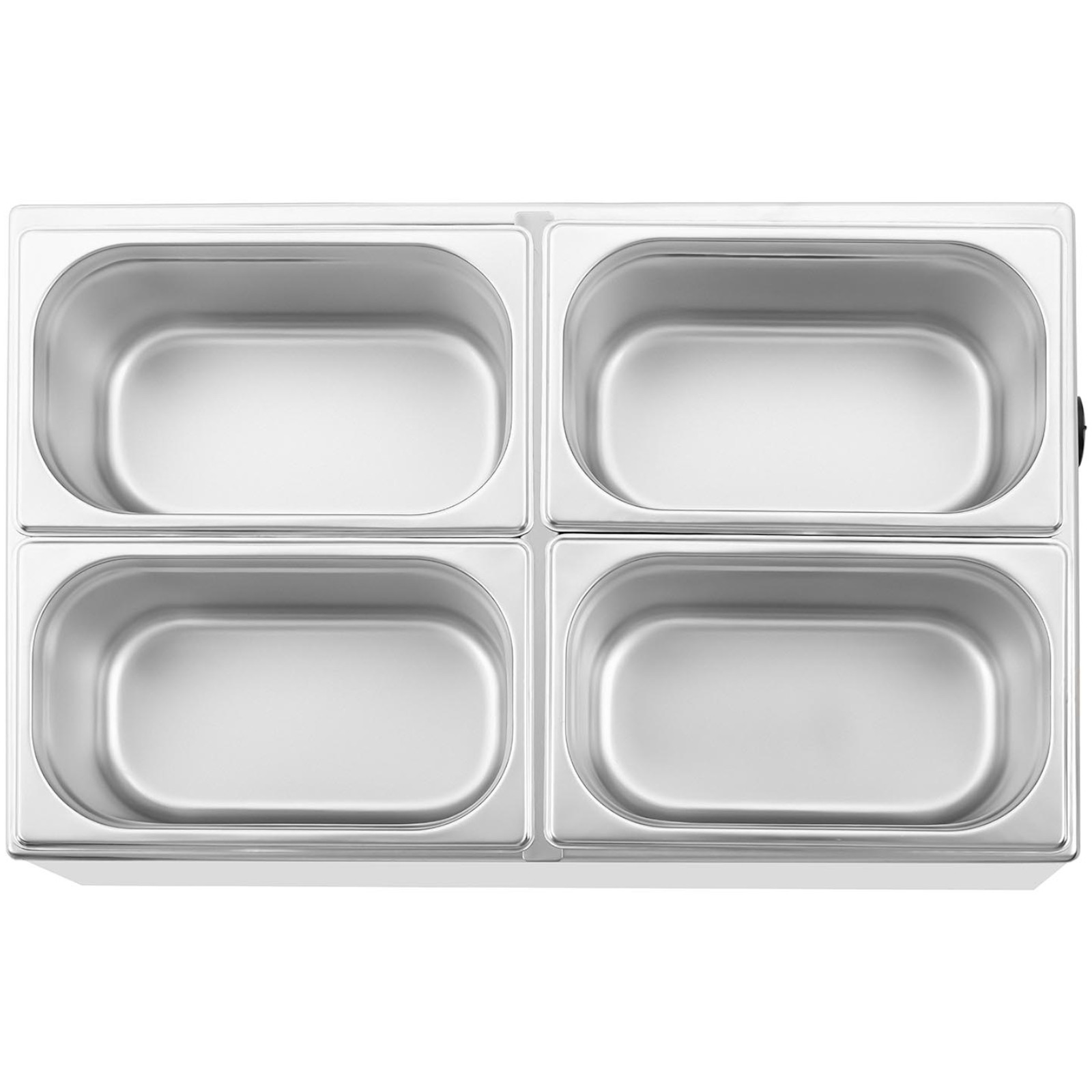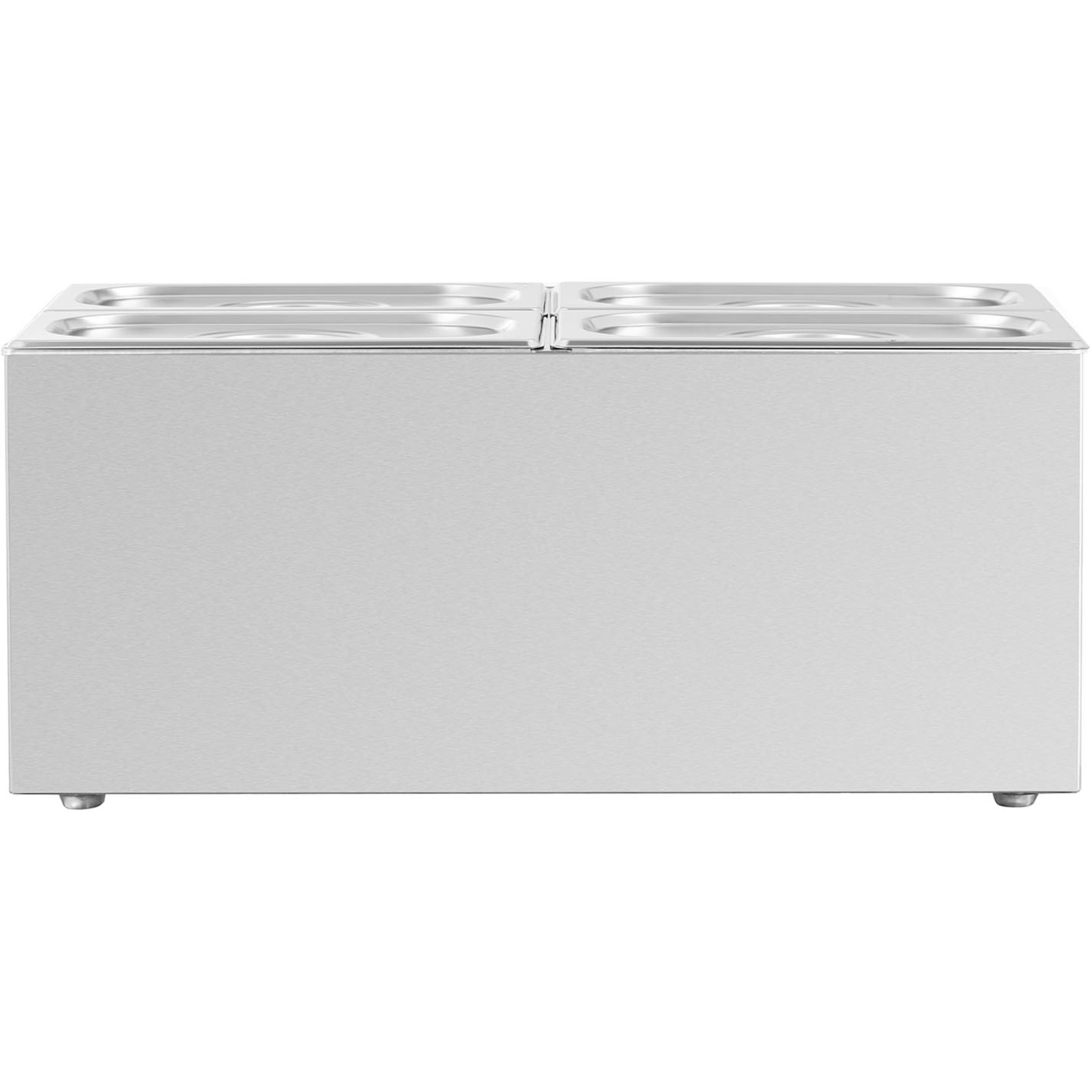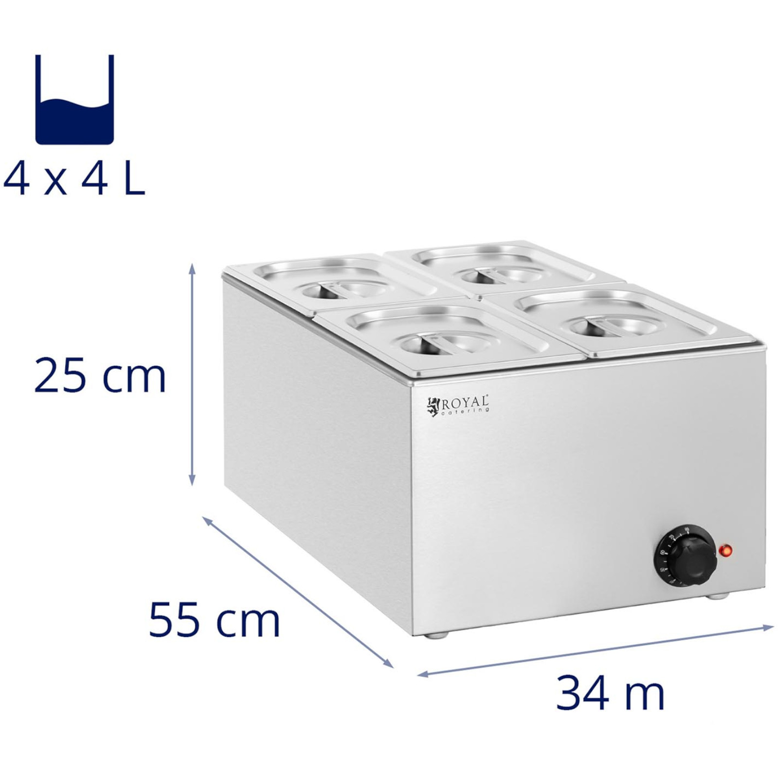 Bemar marki Royal Catering to idealne rozwiązanie do przechowywania potraw w odpowiedniej temperaturze. Jego pojemność wynosząca 16 l pozwala na umieszczenie czterech pojemników GN 1/4, co czyni go doskonałym wyborem dla restauracji, hoteli oraz stołówek.