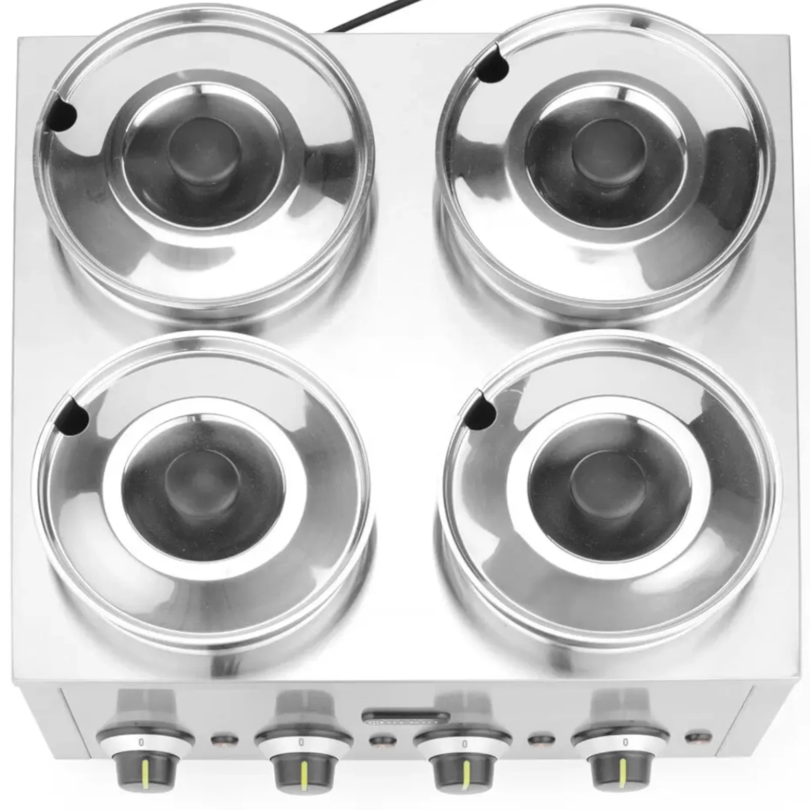 Bemar Thermosystem 4 to funkcjonalne urządzenie, które umożliwia długotrwałe utrzymanie gorących sosów i zup w optymalnej temperaturze. Dzięki regulacji temperatury w zakresie od 30 do 85°C, możesz łatwo dostosować go do własnych potrzeb. Lampka kontrolna informuje o pracy urządzenia, co ułatwia jego obsługę.