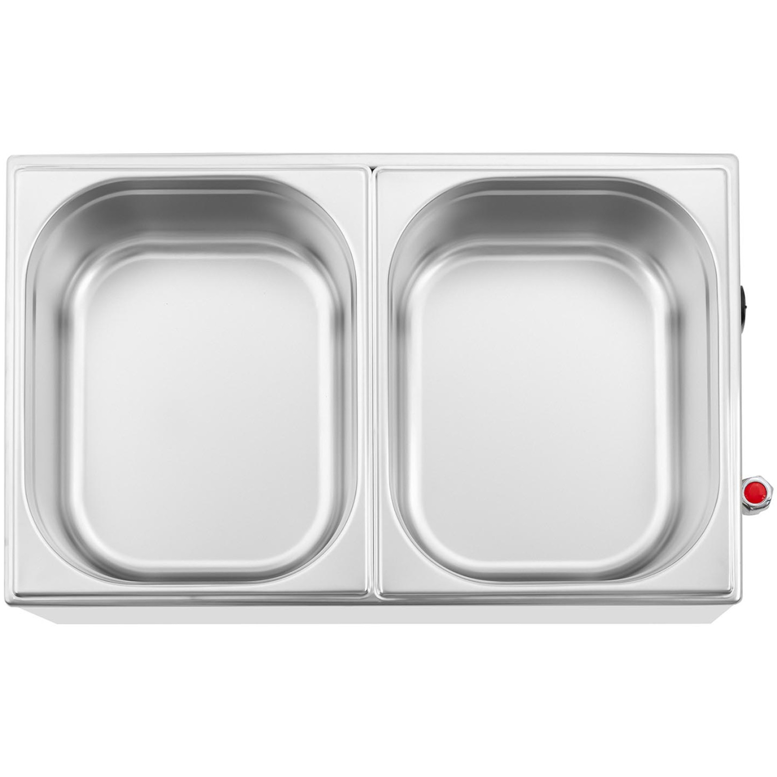 Urządzenie pomieści dwa pojemniki GN 1/2, co pozwala na wygodne podgrzewanie większych ilości jedzenia. Temperatura jest regulowana w zakresie od 30 do 80°C, co zapewnia elastyczność w przygotowywaniu różnych dań. Dodatkowo, kąpiel wodna zapobiega przypaleniu potraw, co jest kluczowe dla ich smaku i jakości.