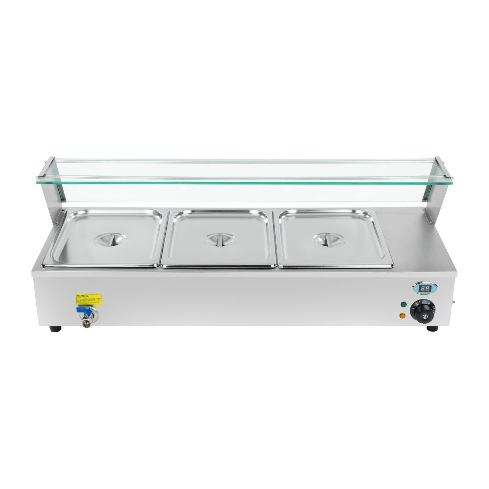 Gładkie powierzchnie urządzenia ułatwiają czyszczenie, a szklana osłona skutecznie chroni potrawy przed zanieczyszczeniami. Dzięki elektronicznemu termostatowi, użytkownik może precyzyjnie ustawić temperaturę w zakresie od 30 do 90 °C. Wydajna grzałka szybko nagrzewa wodę, co zwiększa efektywność pracy.