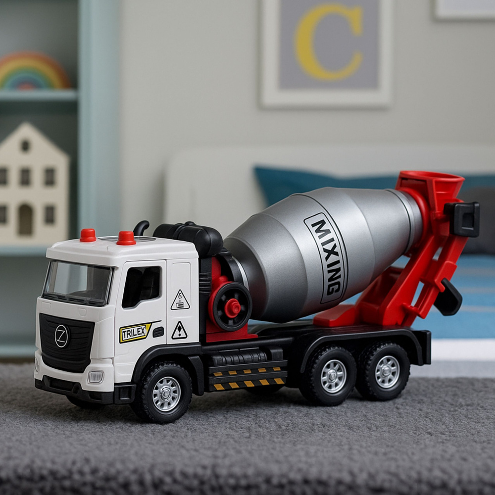 Najważniejszym elementem pojazdu jest obrotowy bęben mieszalniczy, który działa podobnie jak w prawdziwych betoniarkach. Dziecko może wprawiać go w ruch i naśladować proces mieszania betonu, co rozwija wyobraźnię i pozwala tworzyć liczne scenki tematyczne. Model został dodatkowo wyposażony w efekty świetlne oraz dźwiękowe, które aktywują się podczas zabawy, czyniąc ją jeszcze bardziej interesującą i dynamiczną.