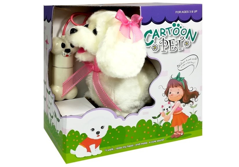 Pies na smyczy wykonany jest z miękkiego i nietoksycznego, który jest bardzo przyjemny w dotyku. Zwierzak ma duże, ciemne oczy, wystający ogonek i duży nos, który delikatnie błyszczy. Ozdobiony jest różową wstążką, dodającą mu uroku. Zabawka posiada długą smycz zakończoną przełącznikiem w kształcie kostki, dzięki czemu dziecko w prosty sposób może sterować swoim pieskiem. Możliwość ta sprawia, że zabawa będzie wydawać się dziecku bardzo rzeczywista, a przede wszystkim ciekawa. Piesek posiada także kokardkę w kolorze różowym, która znacząco zwiększa urok zabawki.