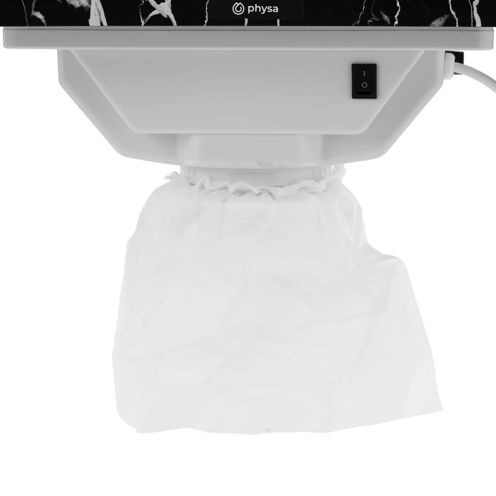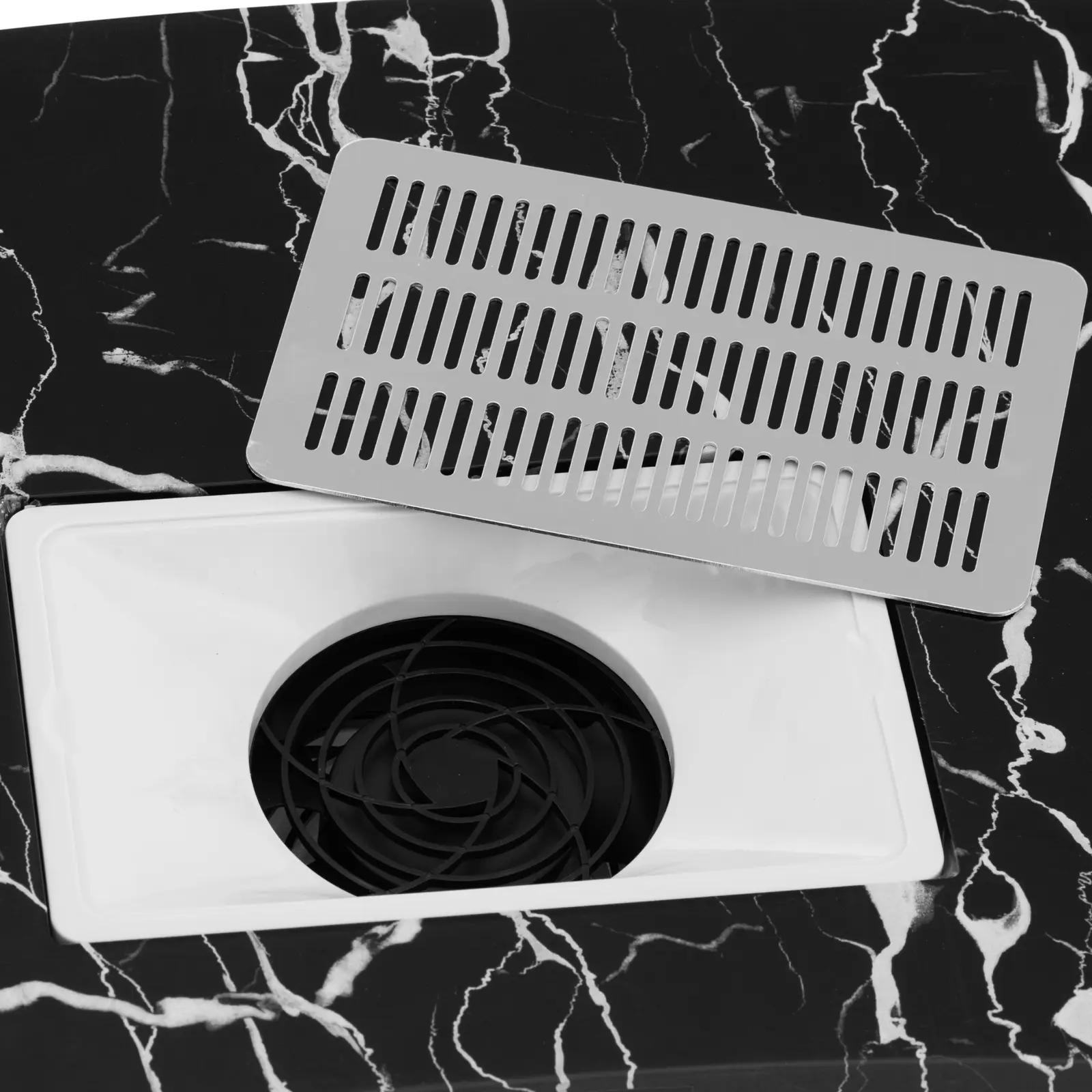 Stolik jest wyposażony w profesjonalny pochłaniacz pyłu, który skutecznie eliminuje kurz i pozostałości po zabiegach, co przekłada się na czystość podczas manicure. W zestawie znajduje się także poduszka pod dłonie, co zwiększa komfort pracy.