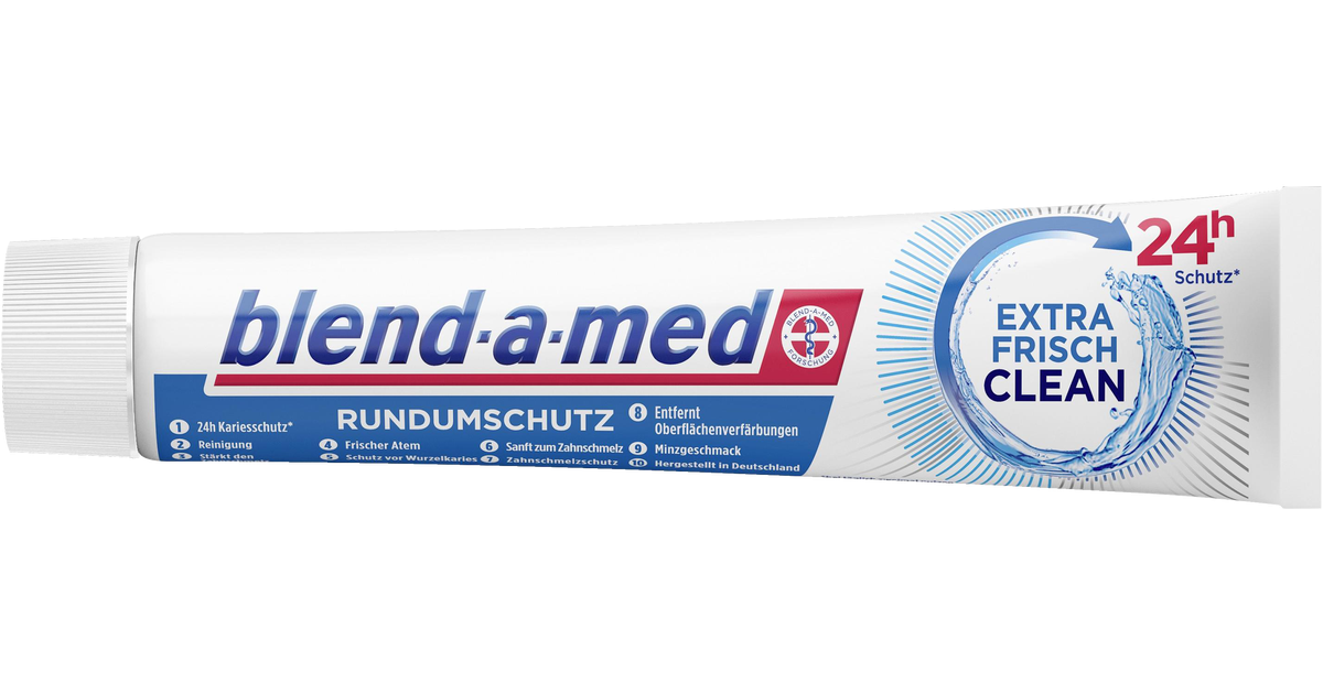 Pasta do zębów Blend-a-med Extra Fresh Clean to uniwersalna ochrona dla Twoich zębów. Zawiera aktywny fluor, który pomaga w utrzymaniu czystości, zdrowia i siły zębów.