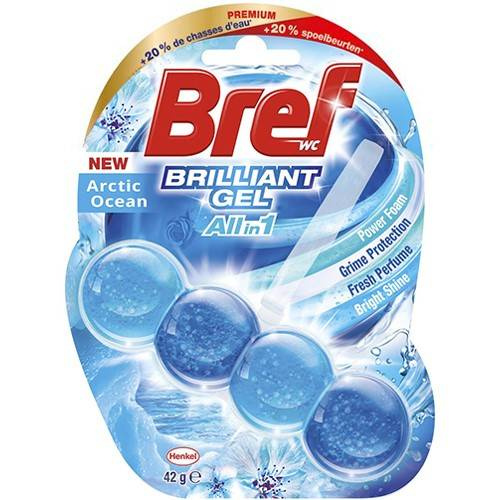Odkryj wyjątkowy żelowy blok toaletowy Bref Brilliant Gel Arctic Ocean. Dzięki innowacyjnemu składowi All in 1, ten produkt oferuje cztery kluczowe funkcje: utrzymuje czystość toalety przy każdym spłukaniu, zapobiega osadzaniu się zabrudzeń, zapewnia świeżość oraz pozostawia błyszczący efekt. Przy każdym spłukaniu, żel przekształca się w aktywny środek czyszczący, który odświeża toaletę i wypełnia ją przyjemnym zapachem.
