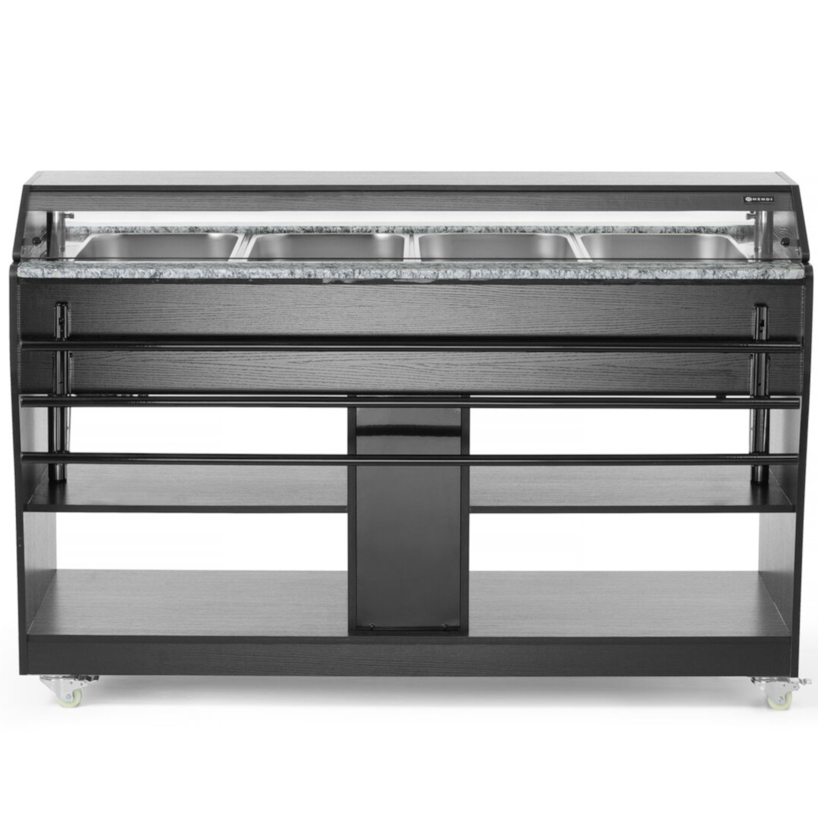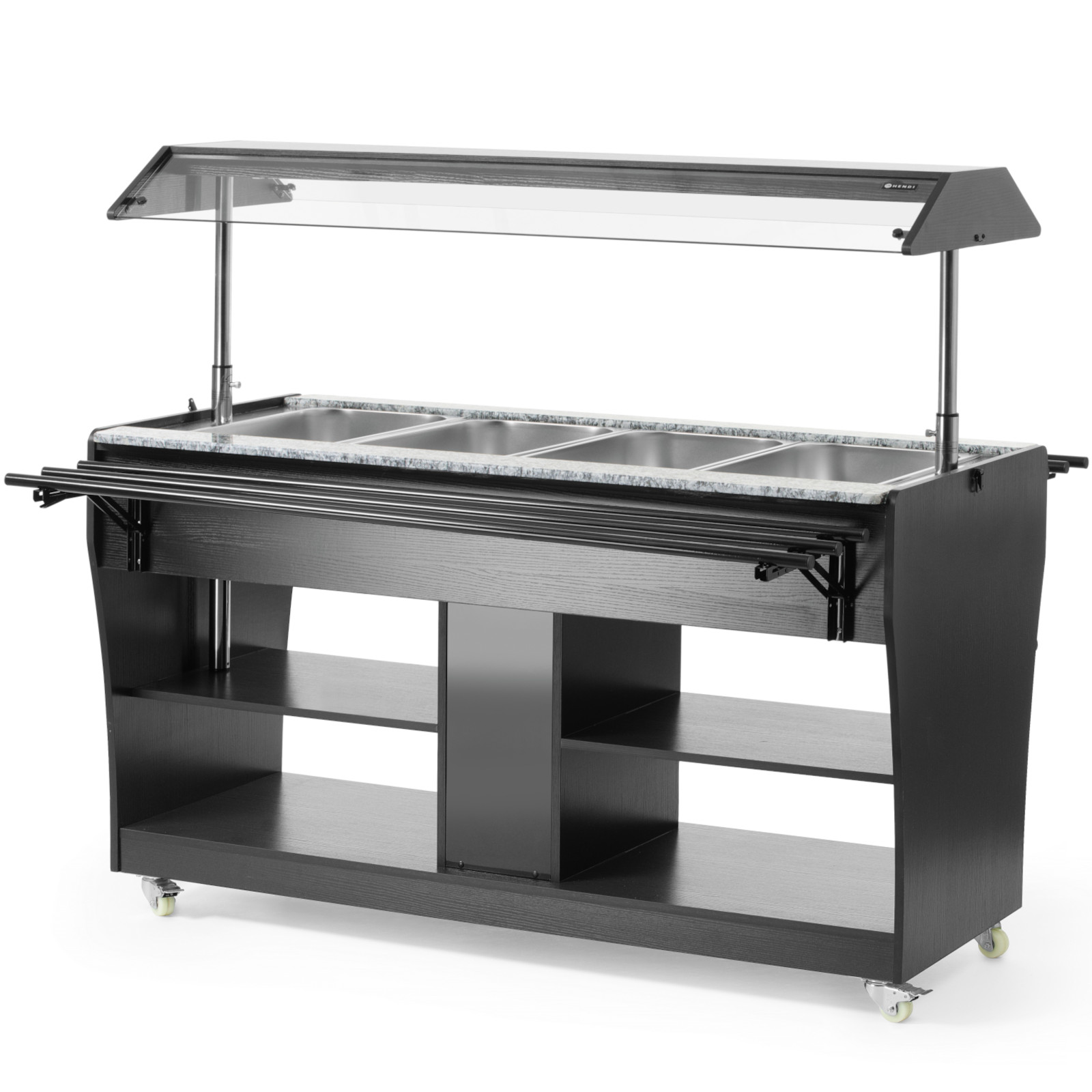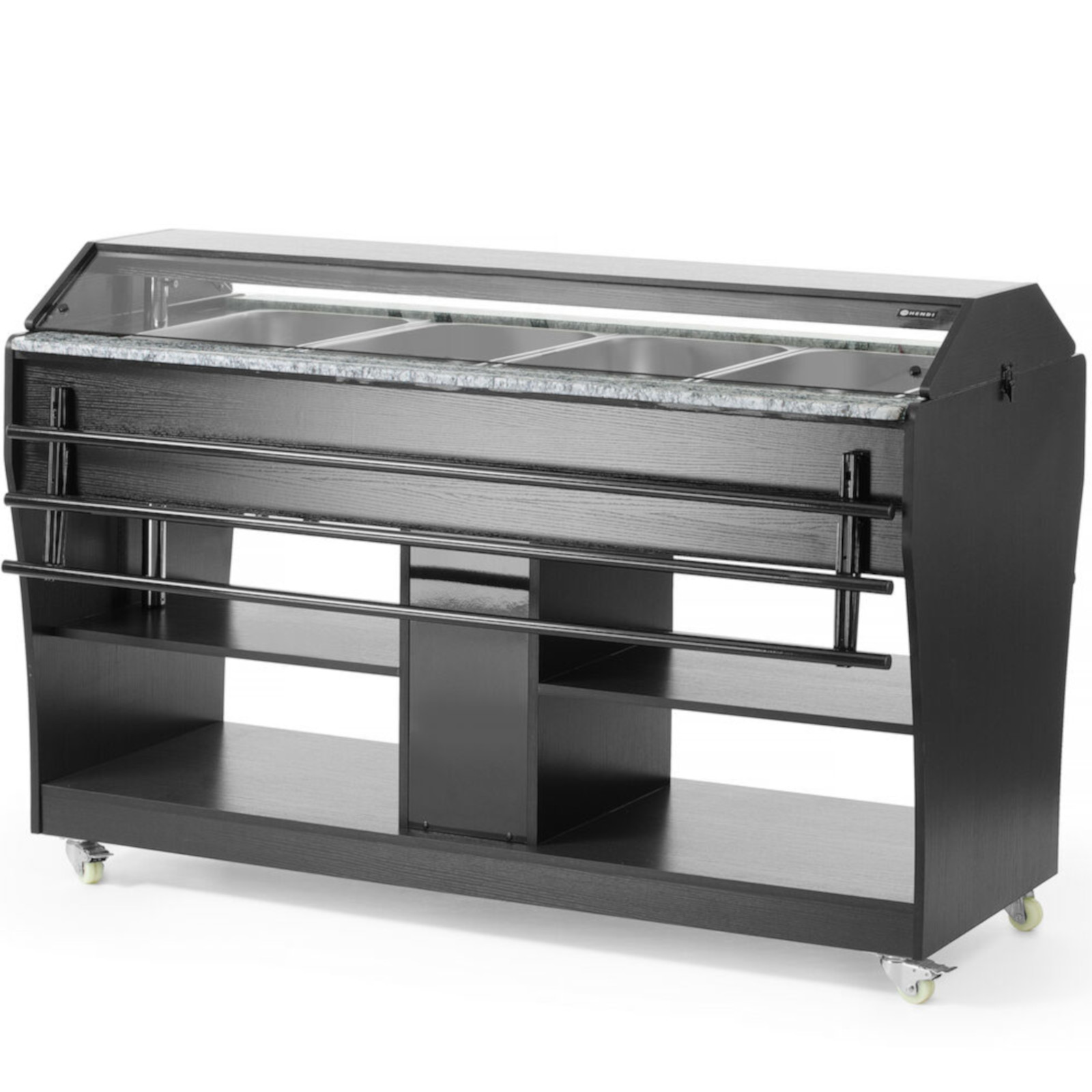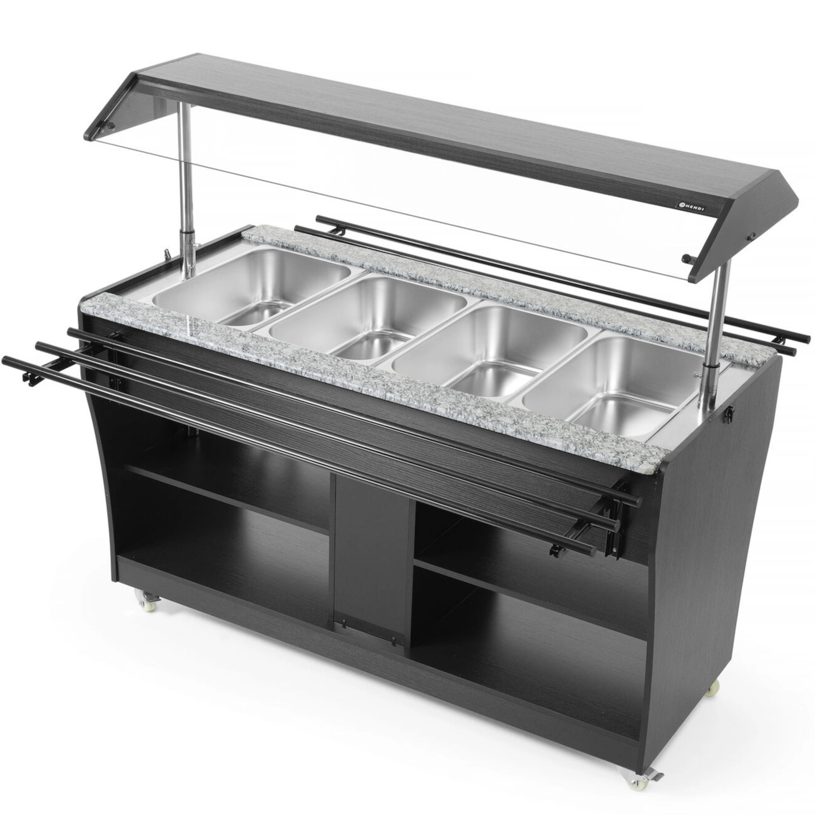 Produkt jest przystosowany do umieszczenia 4 pojemników GN 1/1 o maksymalnej głębokości 150 mm. Dodatkowo, bufet wyposażony jest w składane prowadnice na tace po obu stronach, co zwiększa jego funkcjonalność. Daszek bufetu można opuścić, co zapewnia dodatkową osłonę dla potraw.