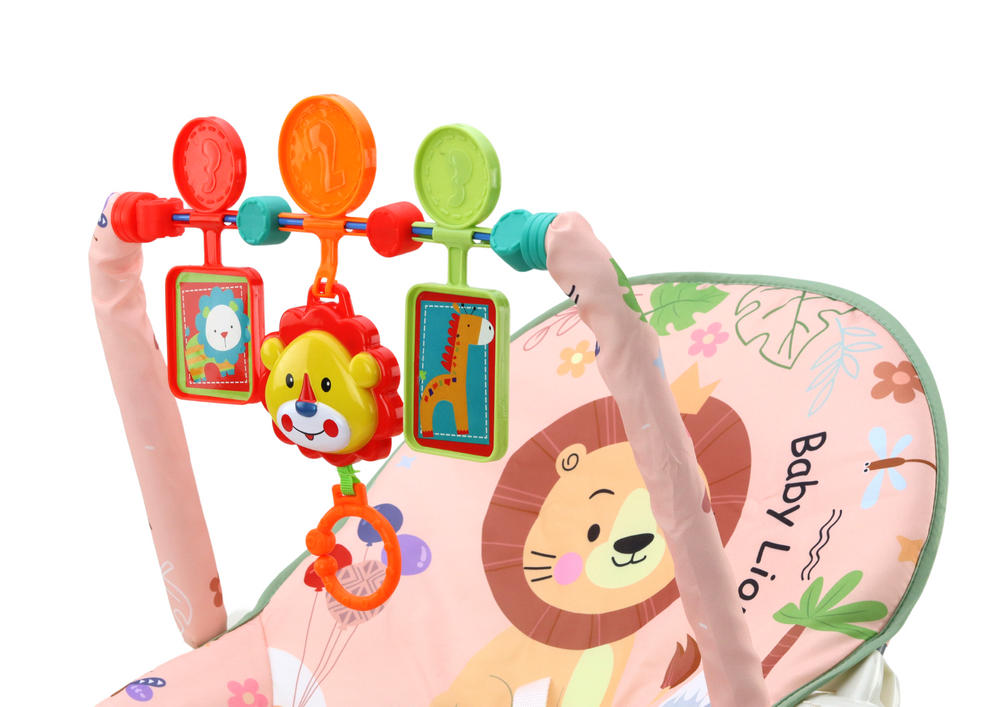 Różowe poszycie bujaczka ozdobione jest uroczym motywem lwa oraz różnych owadów i roślin, co sprawia, że każda chwila spędzona w nim jest pełna przygód i radości. Do bujaczka dołączony jest pałąk z obrotowymi zawieszkami przedstawiającymi urocze zwierzątka: lwa, i żyrafę. Pociągnięcie za pomarańczowe kółeczko przywieszone do lwa powoduje radosne dźwięki melodyjki, co dodatkowo zachęca malucha do interakcji i eksploracji.