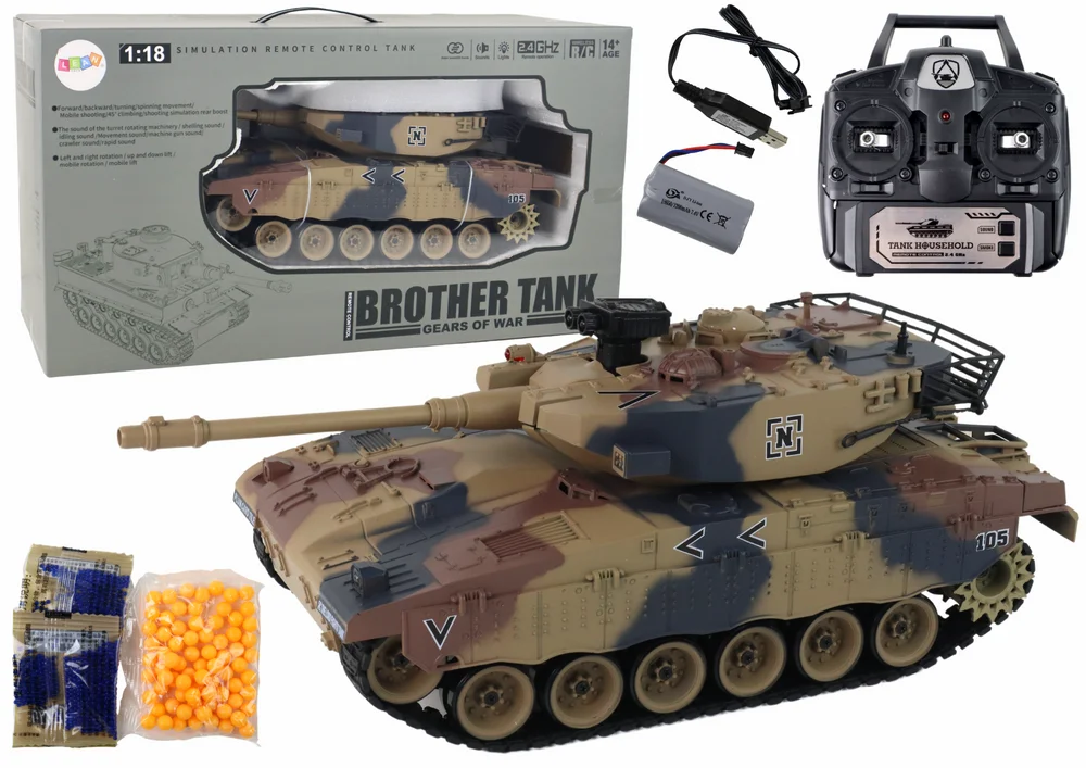 Czołg Zdalnie Sterowny RC 1:18 Armata Dym Tarcza Dźwięki Jasny Brąz