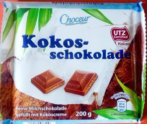 Składniki: cukier, tłuszcz palmowy, masło kakaowe, wiórki kokosowe (9%), mleko pełne w proszku, miazga kakaowa, odtłuszczone mleko w proszku, laktoza, tłuszcz czysty masło, mleko kokosowe (1%), syrop glukozowy, emulgator: lecytyny (soja), białko roślinne, koncentrat soku z cytryny. Może zawierać śladowe ilości orzeszków ziemnych, orzechów, zbóż zawierających gluten oraz jaj.