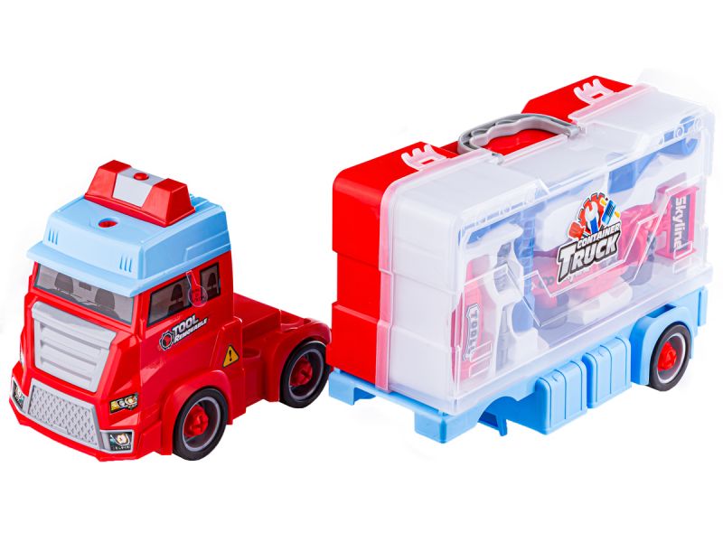 Rozkręcany tir z bolidem to idealna zabawka dla małych majsterkowiczów. Zestaw ten rozwija kreatywność, logiczne myślenie i zdolności manualne. W skład zestawu wchodzi mnóstwo części, m.in. koła, dach ciężąrówki, wyścigówka, śruby.