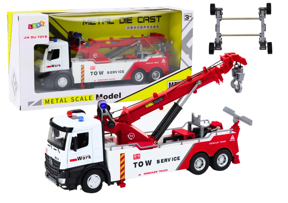 Ciężarówka z dźwigiem to realistyczny model, który zapewnia dzieciom niezwykle angażującą zabawę, rozwijając przy tym ich zdolności manualne i koordynację ruchową. Efektowne biało-czerwone nadwozie, metalowa kabina oraz starannie odwzorowane detale sprawiają, że pojazd wygląda jak prawdziwa maszyna budowlana.