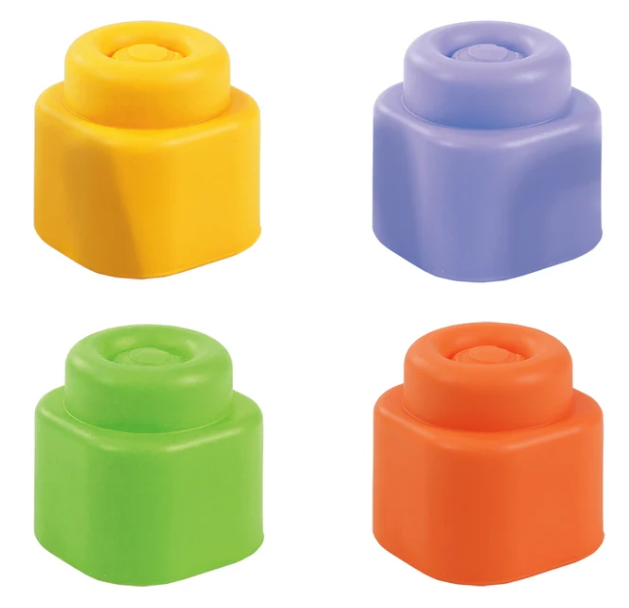 Kostka pełna wypukłych, ciekawych tekstur i funkcji pobudzających sprawność manualną dziecka oraz 4 miękkie klocki do zabawy.