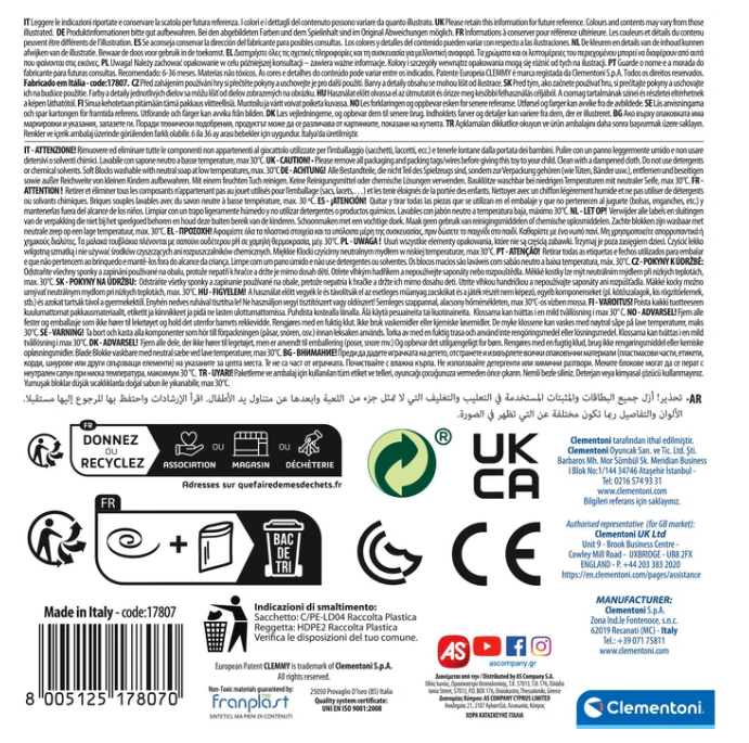 Nowe wiaderko Clemmy z miękką pokrywką, wyposażoną w zróżnicowane formy, struktury i połączenia zachęcające do zabawy 15 klockami dołączonymi do zestawu.
