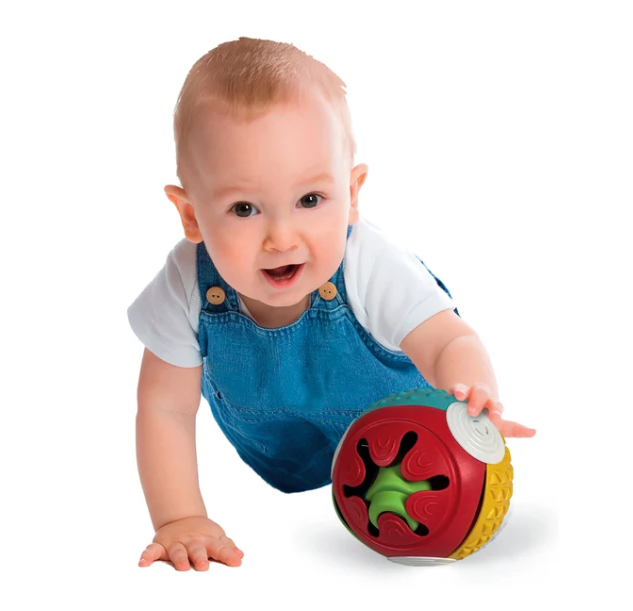 Piłka jest podzielona na 4 części, każda z nich ma inny kolor i inną fakturę, aby stymulować zmysł wzroku i dotyku maluchów.