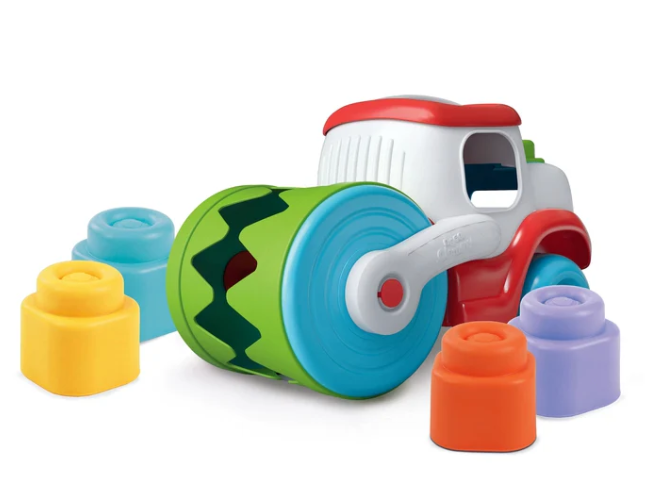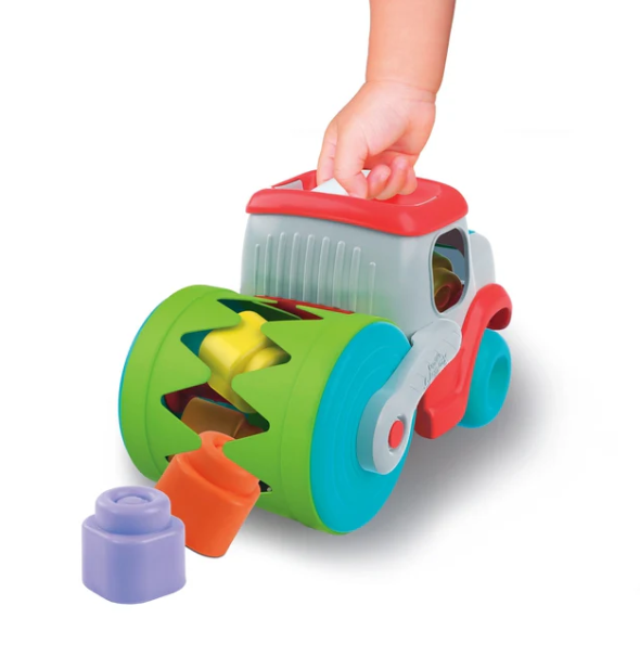 Dziecko bawi się, karmiąc klockami miękką rolkę, budując wieżyczki, wkładając klocki do okienka i wyjmując je z tylnego pojemnika.