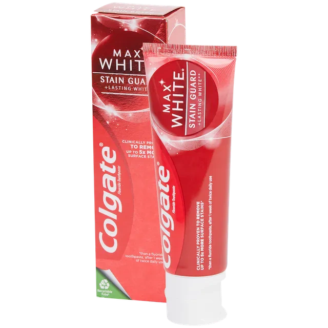 Odkryj nowy Colgate Max White Stain Guard – zaawansowaną formułę do higieny jamy ustnej, która skutecznie zwalcza przebarwienia zębów. Innowacyjna pasta do zębów nie tylko usuwa plamy, ale także chroni przed powstawaniem nowych, zapewniając długotrwałą świeżość oddechu. Dzięki unikalnej kombinacji składników aktywnych, pasta penetruje powierzchnię zębów, eliminując nawet najtrudniejsze przebarwienia.